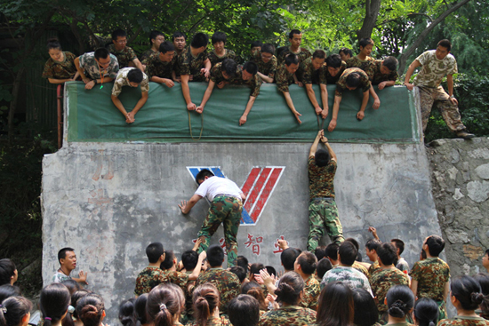團隊項目中,103名隊員僅用了29分鐘就成功翻越了4.3米高的畢業墻,團隊的勝利使畢業生們體驗到集體的力量,體會到甘于奉獻的偉大,樹立了相互支持、精誠團結的團隊精神和合作意識。