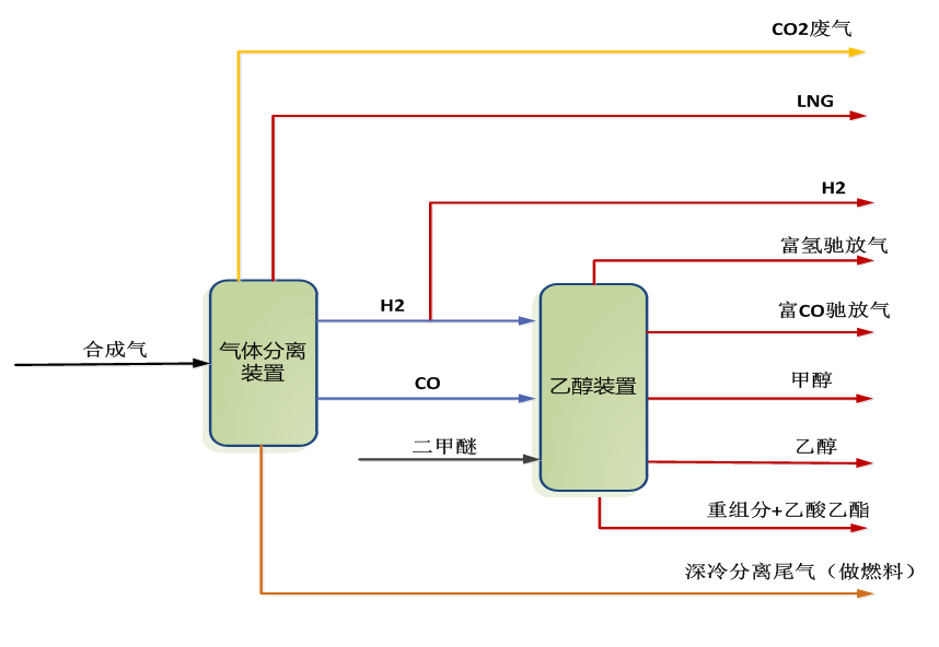 該項(xiàng)目主要產(chǎn)品乙醇、甲醇、氫氣、LNG、重組分及乙酸乙酯。項(xiàng)目擬采用合成氣和二甲醚為原料:外來(lái)合成氣經(jīng)MDEA脫碳后,進(jìn)入氣體分離裝置,氣體分離裝置采用深冷分離+PSA工藝路線生產(chǎn)H2、CO,同時(shí)副產(chǎn)LNG及深冷分離尾氣(做燃料)。外來(lái)二甲醚與CO、H2進(jìn)乙醇裝置生產(chǎn)乙醇產(chǎn)品,同時(shí)副產(chǎn)甲醇、重組分及乙酸乙酯產(chǎn)品。