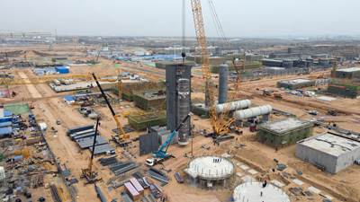 目前,該項目土建施工已完成65%,詳細工程設計已基本完成,設備訂貨完成99%,安裝工程全面陸續推進。其中全廠總變各建筑物建筑裝修基本收尾,核心電氣設備基本完成就位,調試工作陸續開始;全廠公共建筑物(消防站及氣防站、中央控制室、綜合維修、中央化驗室、生產辦公樓)均已封頂,并進行建筑裝修工作;全廠給排水管網完成92.3%,全廠工藝及熱力管網管廊基礎基本完成,系統鋼結構安裝完成22%;甲醇聯合裝置、空分裝置主要建、構筑物已封頂,各管廊、框架基礎基本完成,部分設備就位安裝。