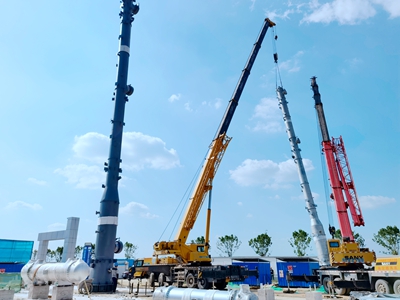 據(jù)悉,此次吊裝吸收塔和再生塔是本項目脫酸單元的核心設(shè)備,為確保本次吊裝的平穩(wěn)有序推進,項目組積極與咸陽禮泉縣道路運輸管理部門、供貨商、施工方等各方對接,確定了發(fā)貨時間、運輸路徑,并嚴格篩查相關(guān)人員行程軌跡,確保吸收塔和再生塔的順利進場。隨后及時進行設(shè)備驗收,同時督促施工方制定并優(yōu)化吊裝方案,確保吊裝機具到位,將吸收塔和再生塔成功吊裝到位。