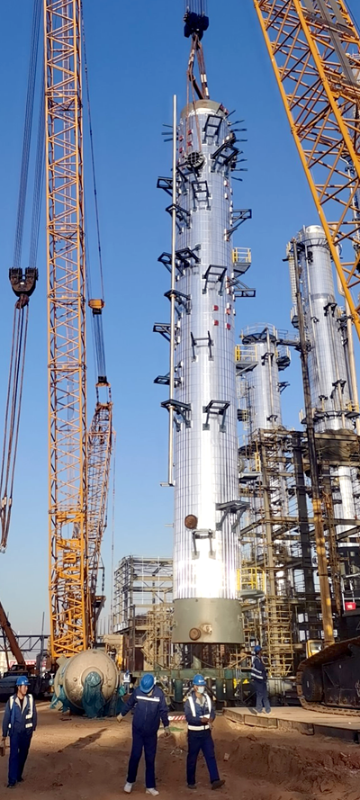 據(jù)悉,該塔是甲醇聯(lián)合裝置最高、最重的設(shè)備,塔分三段到場(chǎng),本次吊裝的為該塔下段,由850噸履帶吊主吊,450噸履帶吊溜尾,接下來(lái)將完成下段環(huán)縫的組對(duì)焊接,為中、上段安裝創(chuàng)造條件。