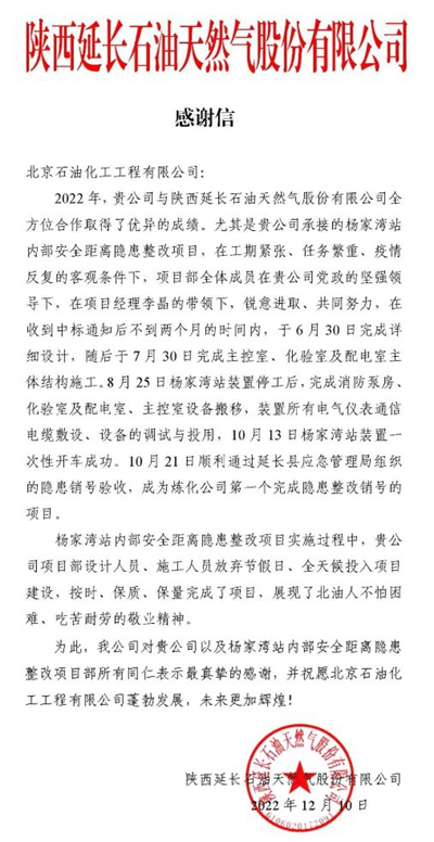 近日,北京石油化工工程有限公司收到來自陜西延長石油天然氣股份有限公司的感謝信,對我公司總承包的楊家灣站內部安全距離隱患整改項目在建設期間精心策劃、合理安排施工、克服不利因素,保質保量按期完成了任務目標,得到了業(yè)主的肯定。