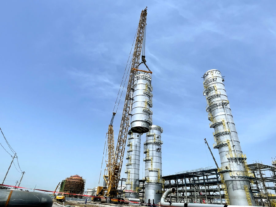 乙醇精制塔上塔上段直徑7.8米,吊裝總高74.4米、總重約220噸,吊裝主吊采用1250噸履帶吊,400噸履帶吊溜尾。設(shè)備于4月16日11時18分起吊,經(jīng)過2小時完成組對合口,順利啟動焊接工作,預(yù)計焊接工作將持續(xù)4至5天。